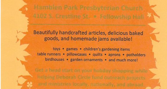 Holiday bazaar with beautifully handcrafted items, delicious baked goods and homemade jams available. Get a head start on holiday shopping while helping Deborah Circle fund outreach projects and ministries locally, nationally and abroad.