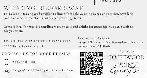 This event is for engaged couples to find affordable wedding décor and for newlyweds to find a new home for their gently used wedding items. Enjoy music, complimentary snacks and drinks for purchase.