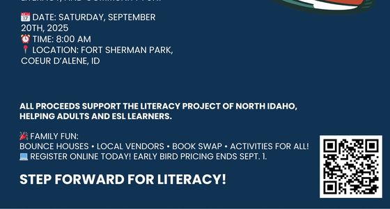 1-mile, 5k, 10k courses and a kid’s dash. 100% of race proceeds go directly to support The Literacy Project of North Idaho, a volunteer-driven 501(c)(3) nonprofit dedicated to helping adults in our community improve their literacy and English language skills.