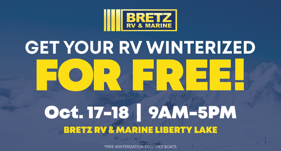 This is your chance to get your RV prepared for the cold winter months with essential services provided at no cost. Services Offered: • Free RV Winterization (Class A Diesels Included!) • Free Roof Inspection • Free Bearing Inspection *This event excludes boats. For these, you must schedule an appointment by visiting https://www.bretzrv.com/rv-service or giving us a call at (509) 253-9553. Must be in line by 3 p.m. for guaranteed service.