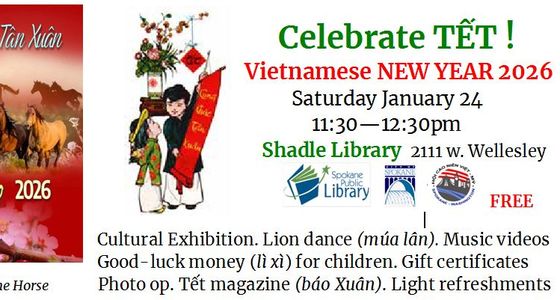 Celebrate Tết, Vietnamese New Year Celebration. Features Tết tradition exhibition, lion dance, music videos, good-luck monies for children, a raffle, photos op, Tết magazines and a light lunch.