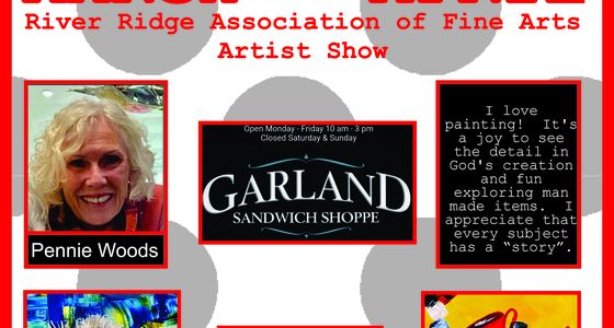 Garland Sandwich Shoppe - Features works by Pennie Woods. Presented by River Ridge Association of Fine Arts. March 2-May 29. 10 a.m.-3 p.m. Monday-Friday.