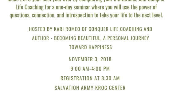 Join Conquer Life Coaching for a one-day seminar where you will use the power of appreciative questions, connection and introspection to take your life to the next level. Make 2019 your best year ever by conquering your limitation. Light lunch provided. Seating limited to 50.