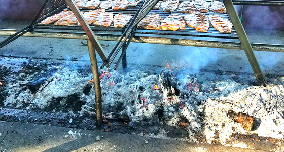 A Green Bluff apple wood fire adds a special flavor to the salmon as it cooks on the 50-foot grill. It is generously coated with our very own secret sauce as the racks move slowly down the line. Dinner includes potato salad, baked beans and dinner roll with ice cream cup and cookies. Coffee, iced tea and milk included. Picnic tables on the grass and under the trees. Wheelchair and walker accessible with assistance.