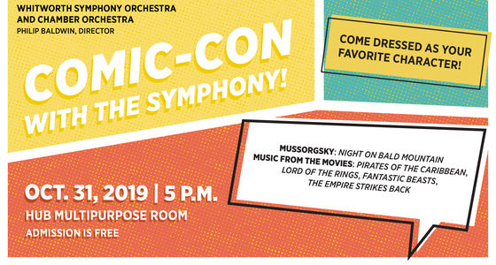 The Whitworth Symphony Orchestra presents a Halloween concert featuring “Night on Bald Mountain” by Mussorgsky as well as music from the scores of “Pirates of the Caribbean,” “Lord of the Rings,” “Fantastic Beasts,” and “The Empire Strikes Back.” Attendees are welcome to come dressed in Halloween costumes. Open to the public.