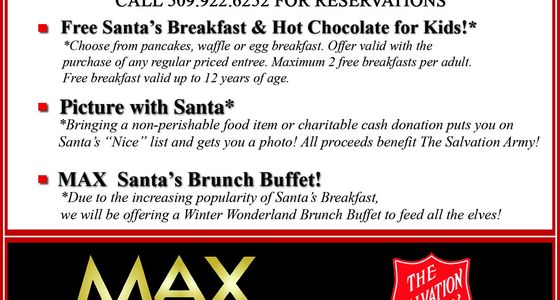 Breakfast and hot chocolate free for kids with the purchase of any regular-priced entree. Non-perishable food item or cash donation to take a photo with Santa. All proceeds benefit the Salvation Army Food Bank.