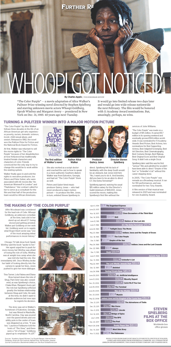 “The Color Purple” — a movie adaptation of Alice Walker’s Pulitzer Prize-winning novel directed by Stephen Spielberg and starring unknown movie actors Whoopi Goldberg, Oprah Winfrey and Margaret Avery — premiered in New York on Dec. 16, 1985: 40 years ago next Tuesday.