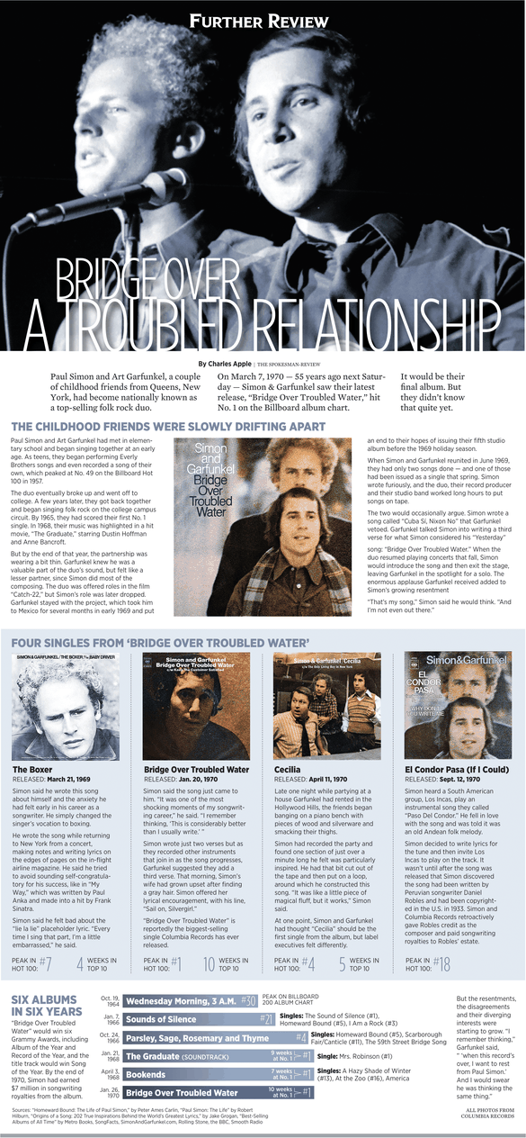 Friends since elementary, Paul Simon and Art Garfunkel were champions of rock in the '60s. They drifted apart steadily, until their final album, 'Bridge Over Troubled Water.'