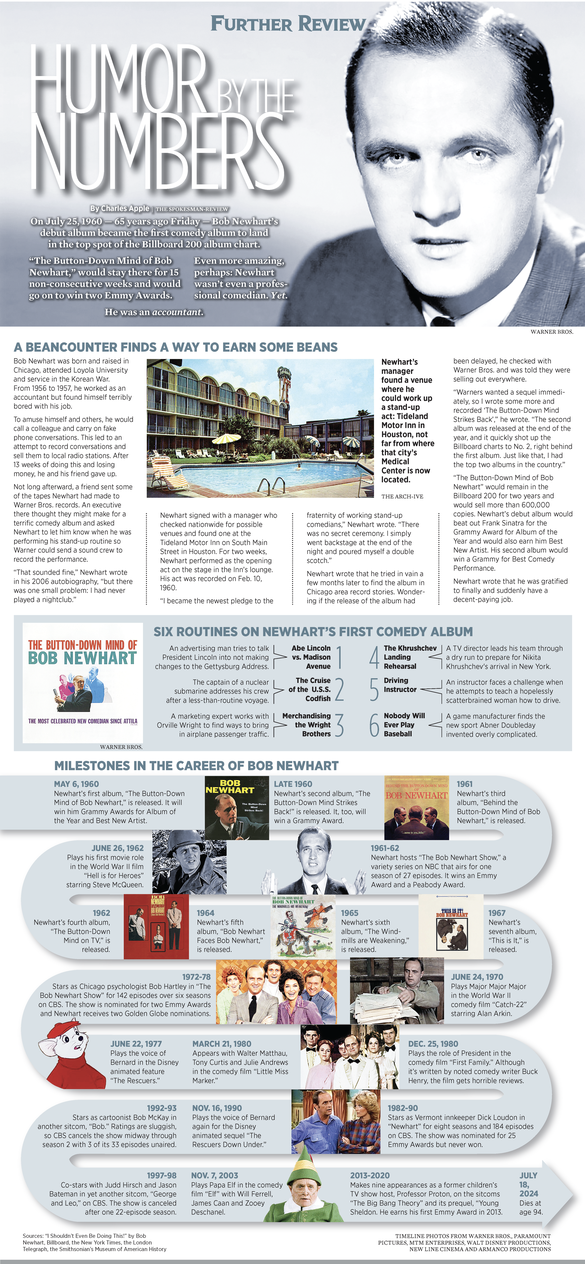 On July 25, 1960 — 65 years ago Friday — Bob Newhart’s debut album became the first comedy album to land in the top spot of the Billboard 200 album chart.
