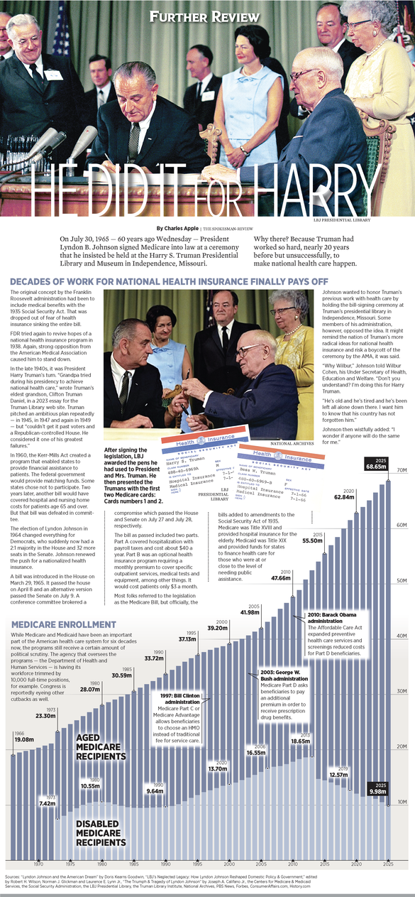 On July 30, 1965 — 60 years ago Wednesday — President Lyndon B. Johnson signed Medicare into law at a ceremony that he insisted be held at the Harry S. Truman Presidential Library and Museum in Independence, Missouri.