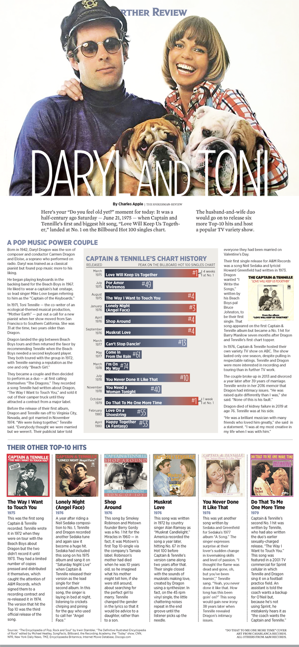 Daryl and Toni: Love Will Keep Us Together Half a century ago, Captain and Tennile's first and biggest hit, "Love Will Keep Us Together," landed at No1.