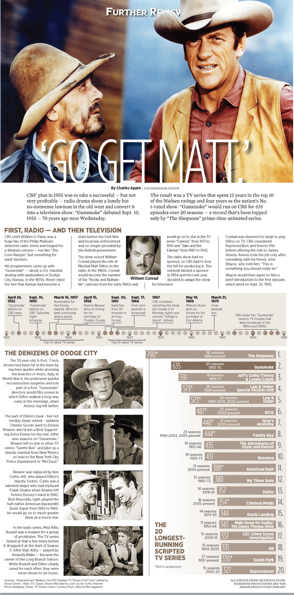 CBS’ plan in 1955 was to take a successful — but not very profitable — radio drama about a lonely but no-nonsense lawman in the old west and convert it into a television show. “Gunsmoke” debuted Sept. 10, 1955 — 70 years ago next Wednesday.