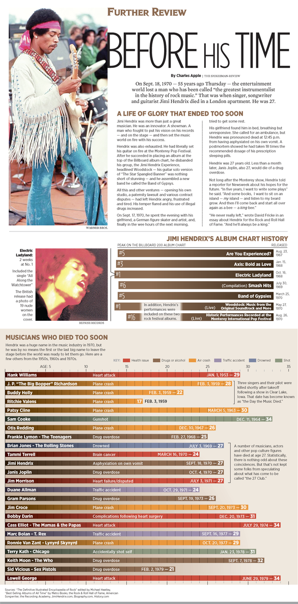 On Sept. 18, 1970 — 55 years ago Thursday — the entertainment world lost a man who has been called “the greatest instrumentalist in the history of rock music.” That was when singer, songwriter and guitarist Jimi Hendrix died in a London apartment. He was 27.