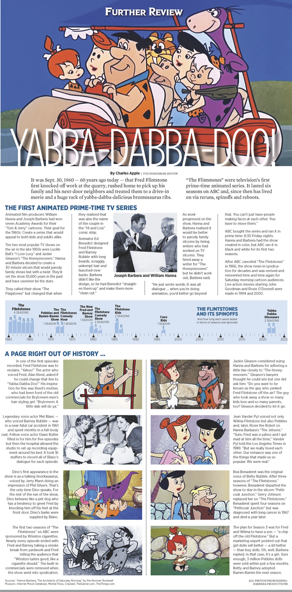 It was Sept. 30, 1960 — 60 years ago today — that Fred Flintstone first knocked off work at the quarry, rushed home to pick up his family and his next-door neighbors and treated them to a drive-in movie and a huge rack of yabba-dabba-delicious brontosaurus ribs.