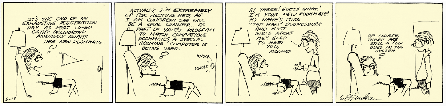 Trudeau graduates from Yale. The syndicate asks Trudeau to redraw some of the strips he had submitted — put clothes on some of the coeds, clean up the language and so on. By the end of July, Trudeau has eight weeks of strips, ready to distribute.