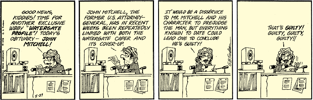 Trudeau’s Watergate-themed “Guilty, Guilty, Guilty” strip causes a stir. The Washington Post is one of a dozen papers that refuse to run it. The Lincoln (Nebraska) Journal moves the strip to its Op-Ed page. Before a long, a quarter of Trudeau’s clients are running “Doonesbury” on their editorial pages.