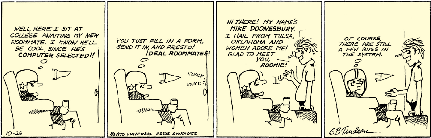 Garry Trudeau, age 18, starts college at Yale University and begins drawing a comic strip about an awkward freshman who has trouble meeting girls. The strips go unpublished. Instead, Trudeau begins writing occasional columns for the Yale Daily News and becomes editor of the campus humor magazine. He also serves on a social committee chaired by upperclassman George W. Bush.