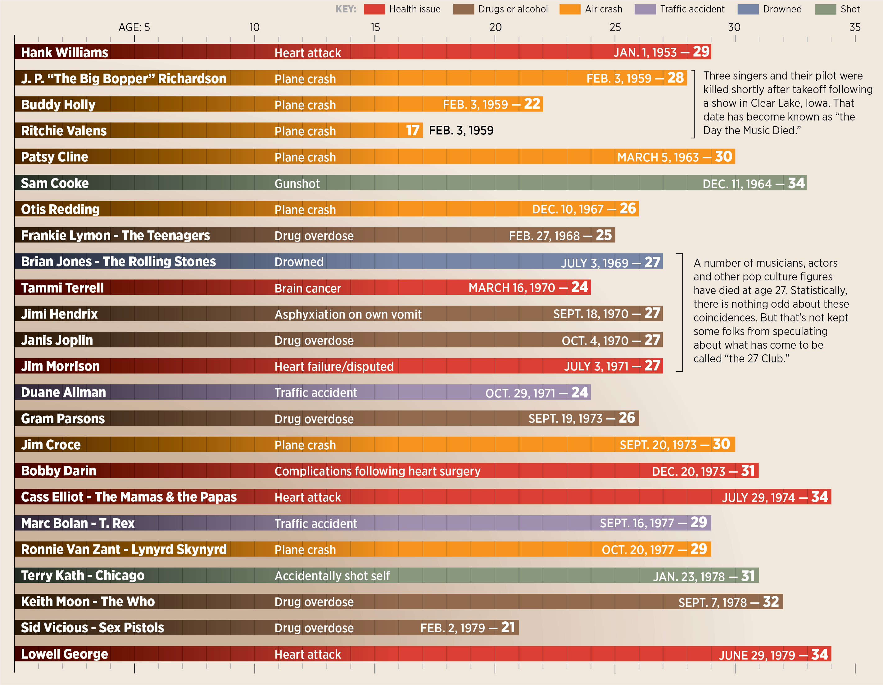 Hendrix was a huge name in the music industry in 1970, but he was by no means the first or the last big name to leave the stage before the world was ready to let them go. Here are a few others from the 1950s, 1960s and 1970s.