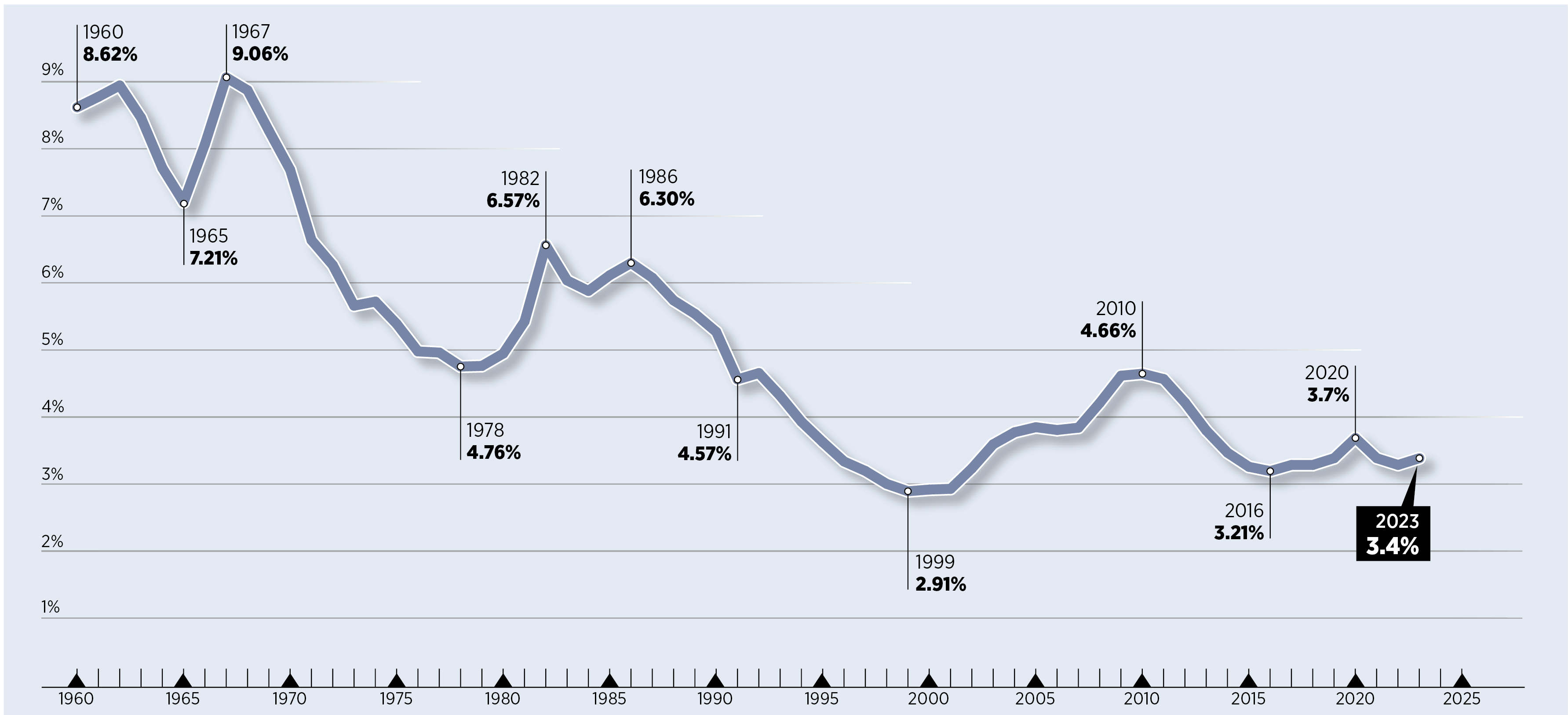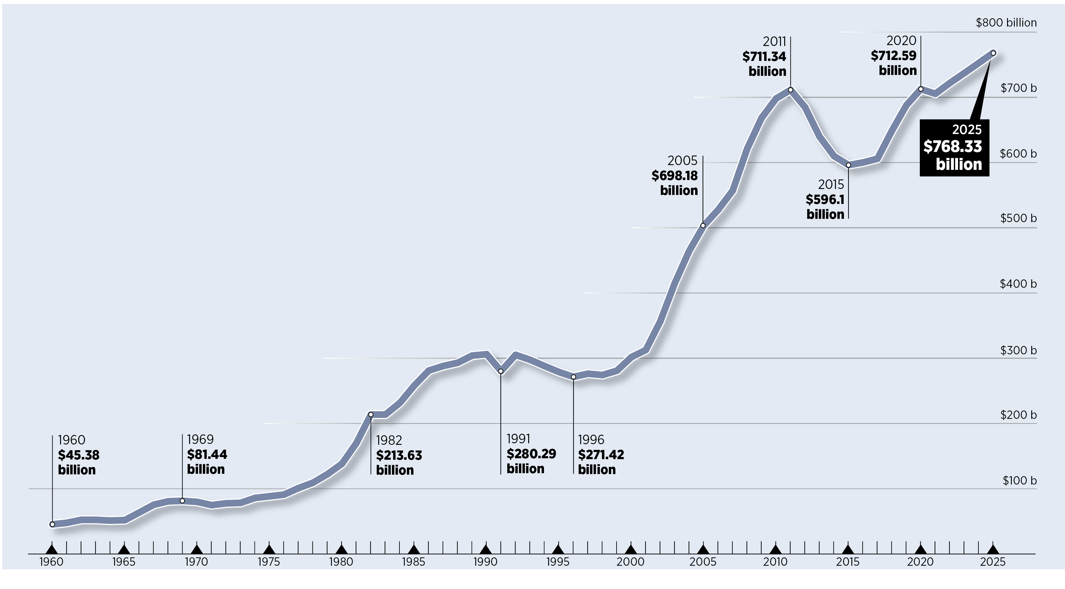 For fiscal year 2025, military spending in the U.S. was nearly 17 times what it was during Ike's last year in office. It's especially bombed since the terrorist attacks of Sept. 11, 2001.