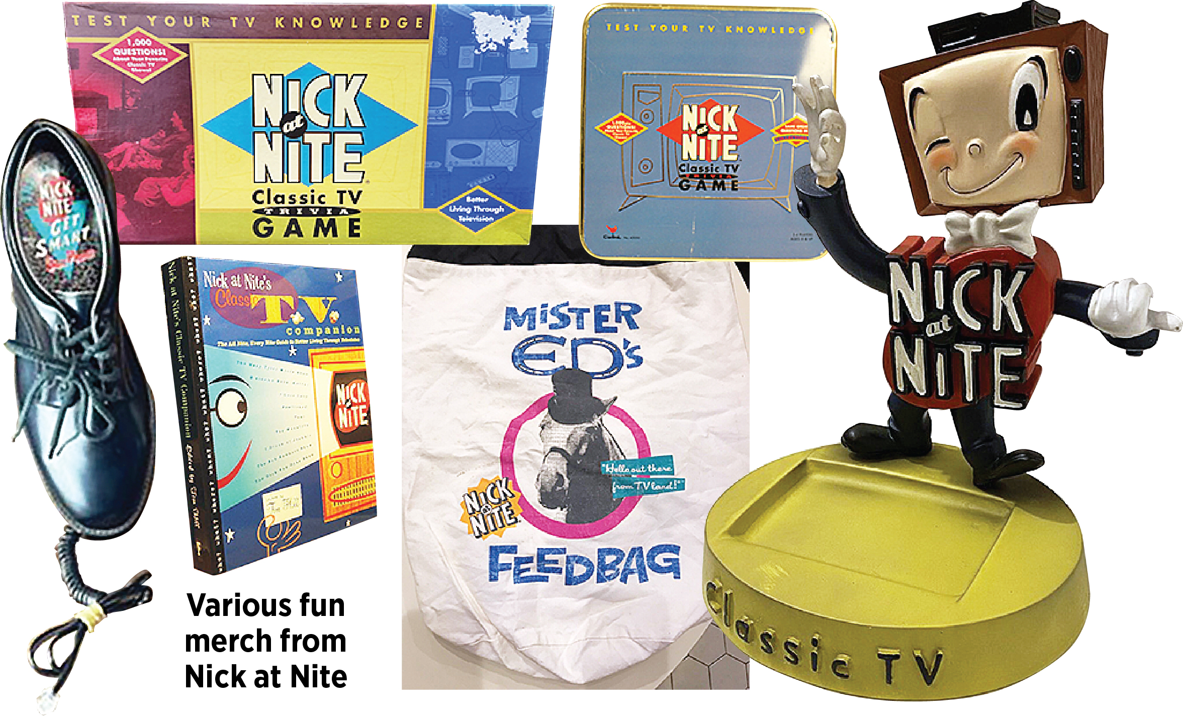 One memorable example was a Nick at Nite travel kit that included a “Get Smart Shower Cap of Silence” and “Alfred Hitchcock Spine-Tingling Soap.” It also sold a working house phone based on secret agent Maxwell Smart’s shoe phone seen on “Get Smart.”