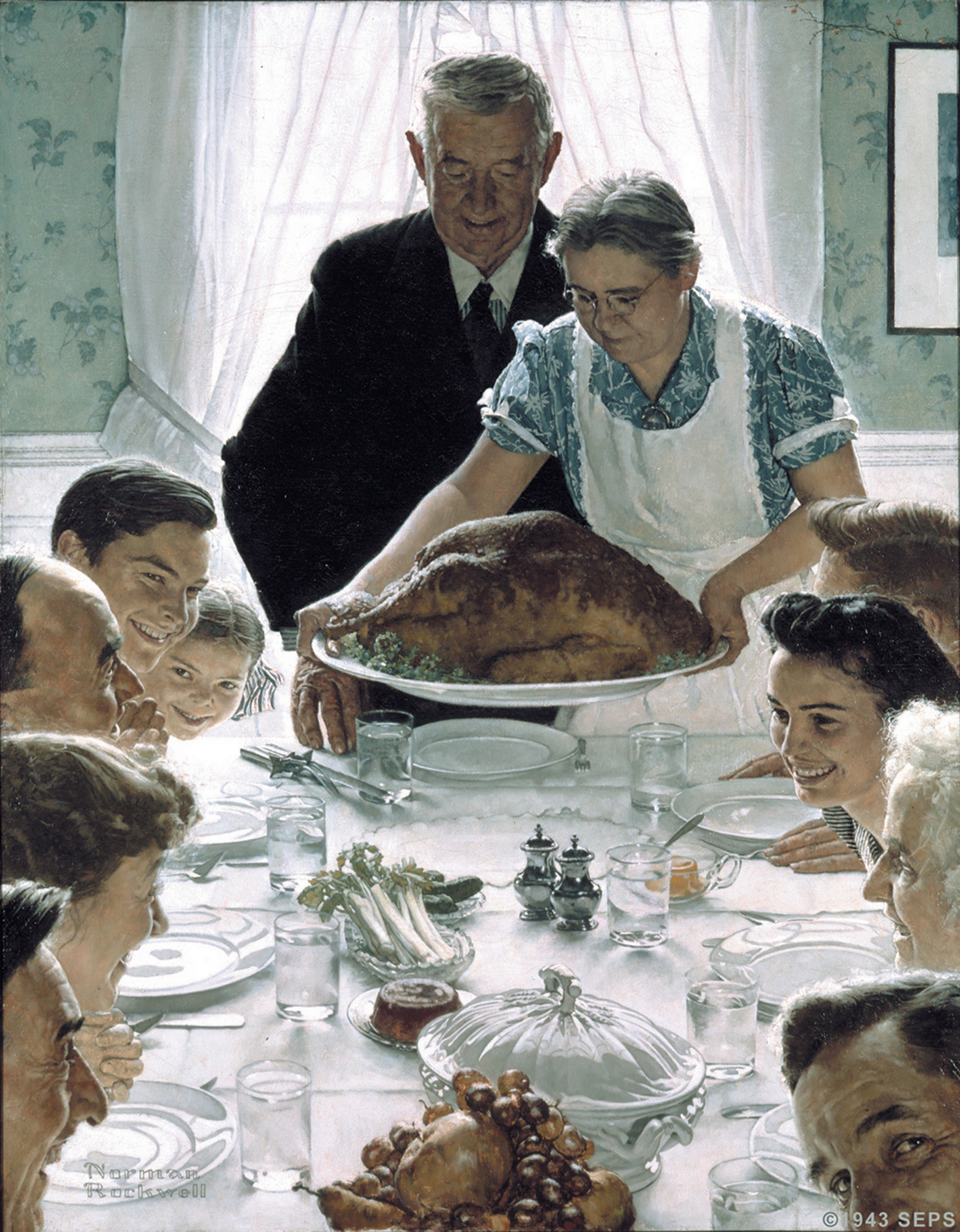The most famous of the Four Freedoms paintings, Rockwell said he painted his actual Thanksgiving dinner. “Our cook cooked it, I painted it and we ate it,” Rockwell later said. “That was one of the few times I’ve ever eaten the model.”