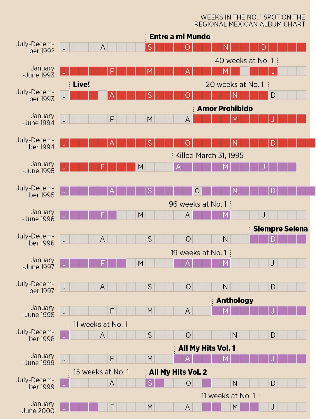 Selena’s previous Latino album, “Amor Prohibido,” had spent 47 consecutive weeks at No. 1 on Billboard’s Regional Mexican album chart before she was killed. After her murder, the album regained the No. 1 spot and spent another 27 consecutive weeks in the top spot. It would return to No. 1 yet again in October for another 18 consecutive weeks. In all, “Amor Prohibido” would spent 96 weeks at No. 1.