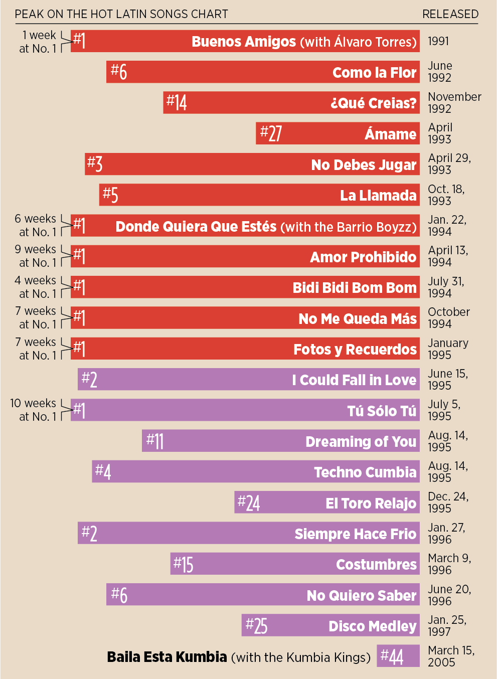 Released in March 1994, "Amor Prohibido" would occupy No. 1 on Billboard's Regional Mexican Album Chart for 96 out of 109 weeks through May 1996.