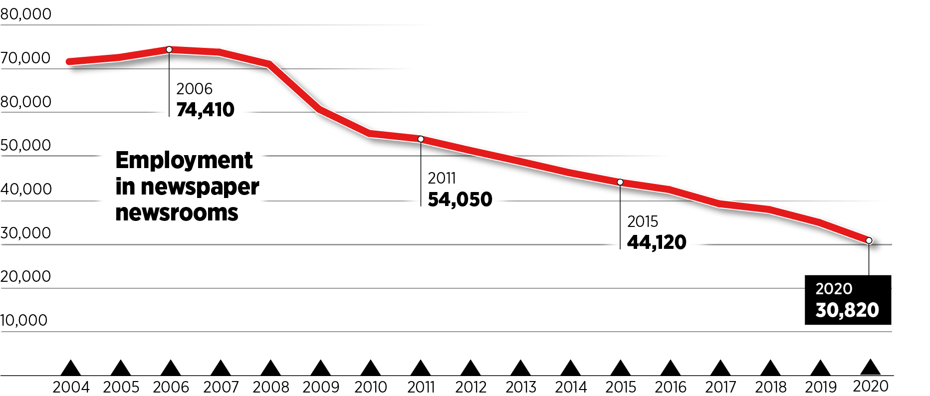 The number of people employed in newspaper newsrooms has shrunk nearly 60% over the past 17 years. This means fewer reporters, fewer photographers and fewer editors. This means less coverage of local issues, businesses and sports. In some cases, it means a paper might reduce its print schedule to only three or four issues a week.