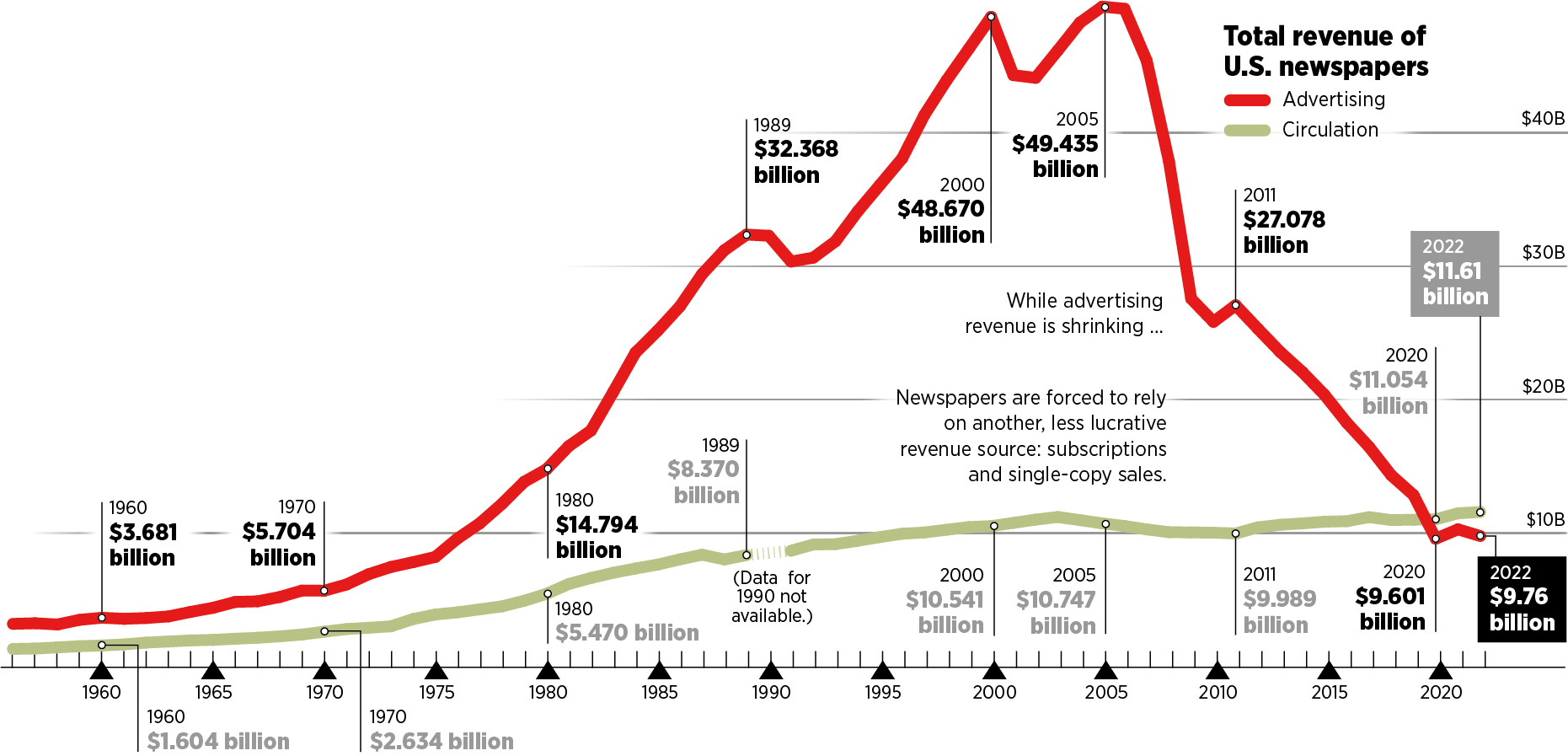 Newspapers have succeeded in gaining a larger share of the digital ad market. But digital ads pay a fraction of what print ads used to bring in. Advertising revenue — upon which the industry was built — has dropped by more than 80% since its peak in 2005.