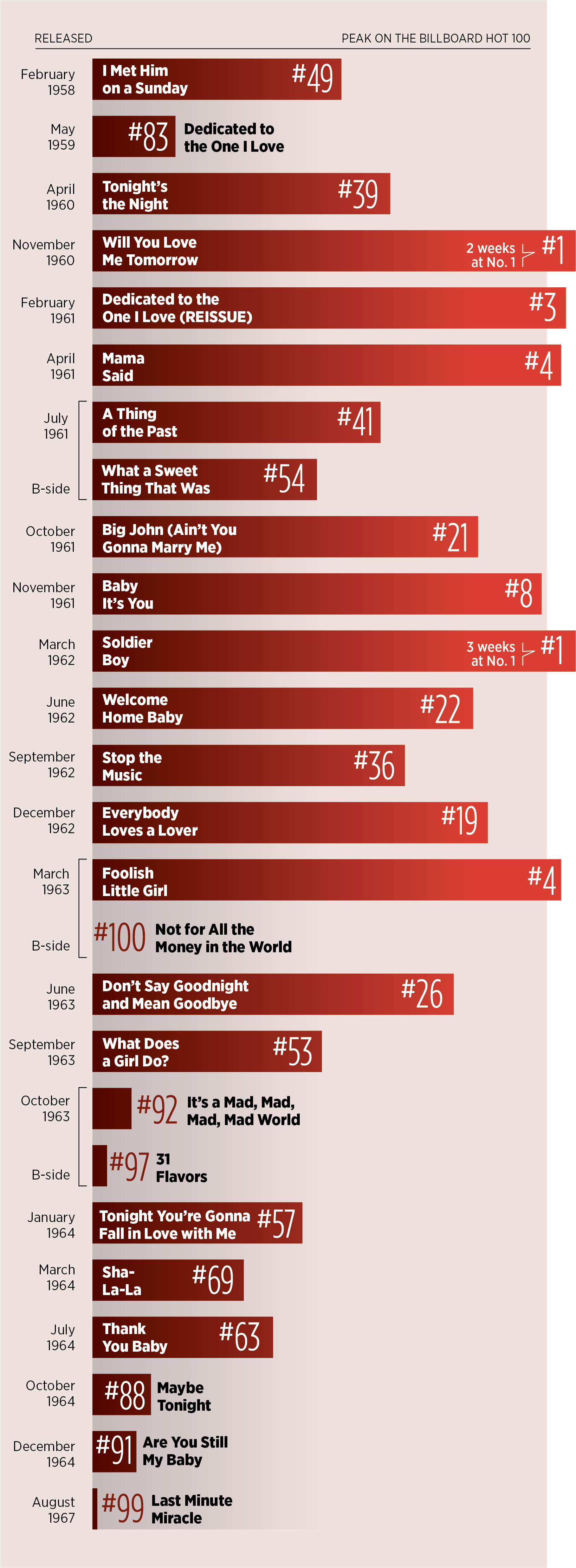 But most of the top Hot 100 hits had been by men or male groups. Connie Francis and Brenda Lee had released two singles each that had landed at No. 1 in 1960.