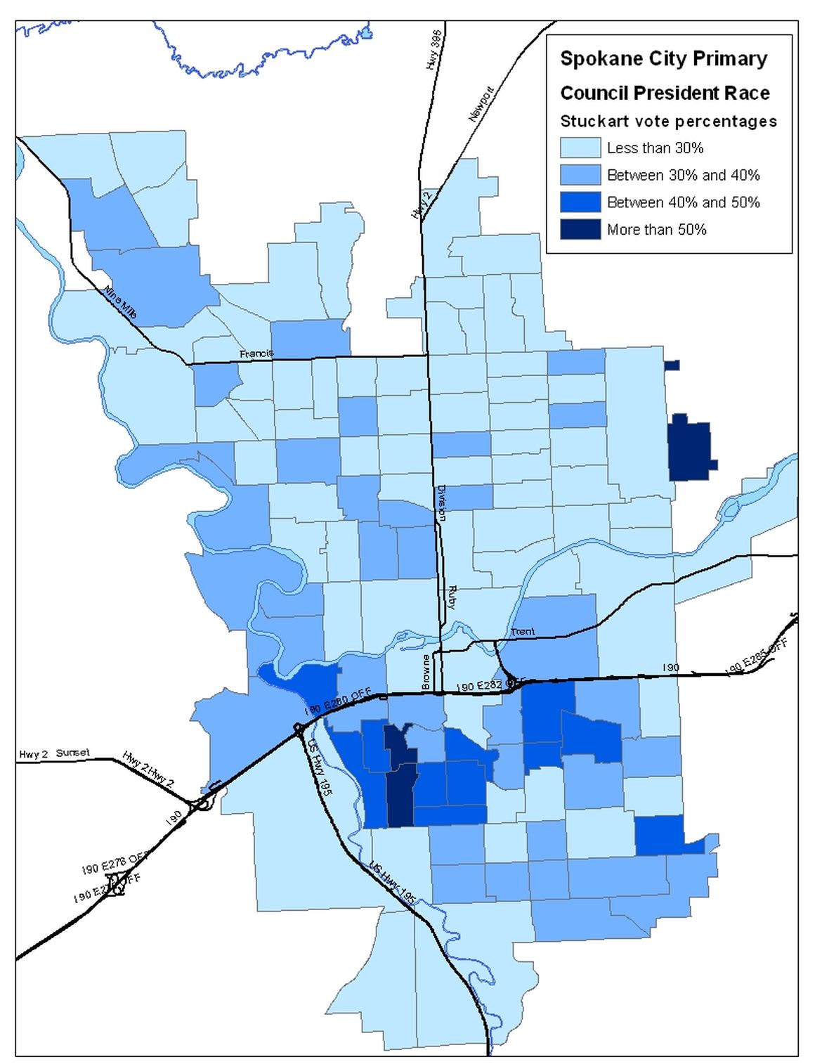 This is a computer generated map of the City Primary votes for Ben Stuckart in the Spokane City Council President race, based on ballots counted on election night