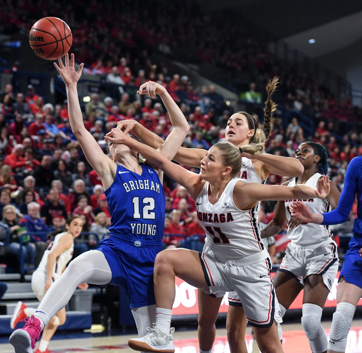 Gonzaga guard Laura Stockton lays it on BYU Caitlyn Alldredge, Saturday, Feb. 16, 2019, in the McCarthey Athletic Center. D