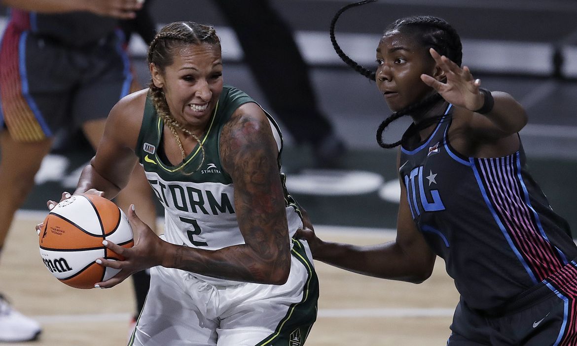 Seattle Storm center Mercedes Russell (2) drives as Atlanta Dream forward Elizabeth Williams, right, defends during the second half of a WNBA basketball game Friday, June 11, 2021, in College Park, Ga.
