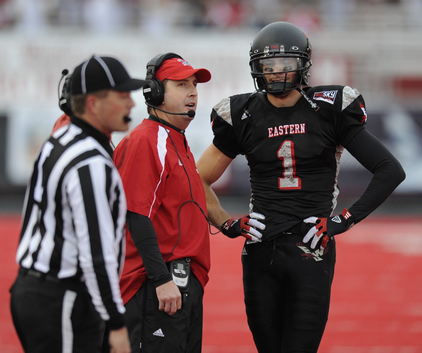 EWU head coach Beau Baldwin chats with wide receiver Brandon Kaufman in the fourth quarter, Saturday.