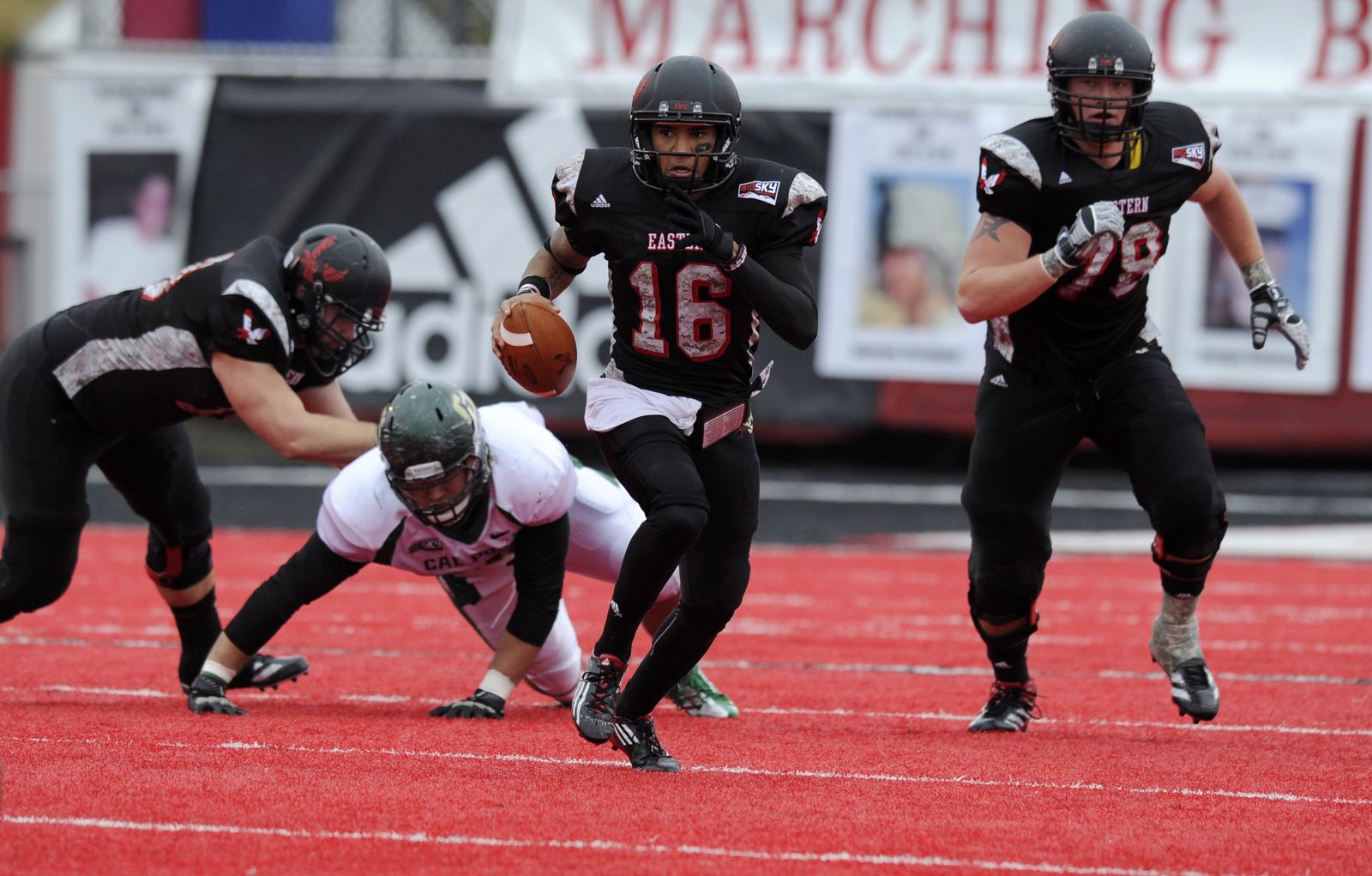 Not finding a passing lane, Eastern Washington University’s quarterback Vernon Adams (16) runs the ball against Cal Poly in the first quarter Saturday, Nov. 3, 2012, in Cheney, Wash.