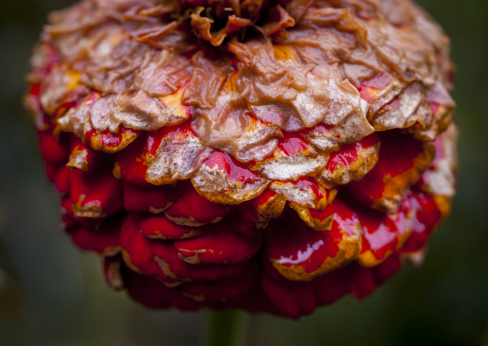 Frosty mornings have taken a toll on a zinnia bloom wilting in a yard at 17th Avenue and Wall Street, Thursday Oct. 25,2012, in Spokane, Wash.