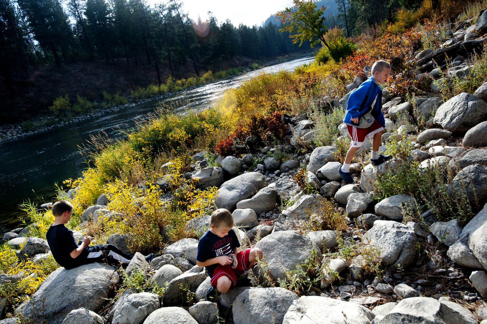 Benjamin, 7, right, leaps from rock to rock as his twin brother Bradley, 7, center, and older brother, Jordan, 10, left, chip rocks together to make arrowheads as they play on Friday, Oct. 12, 2012, at Riverside State Park in Spokane, Wash. The brothers were camping with their family along the river and enjoying the start of fall.