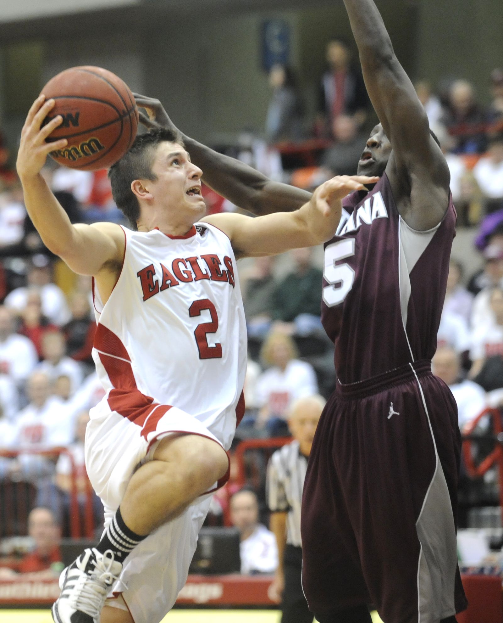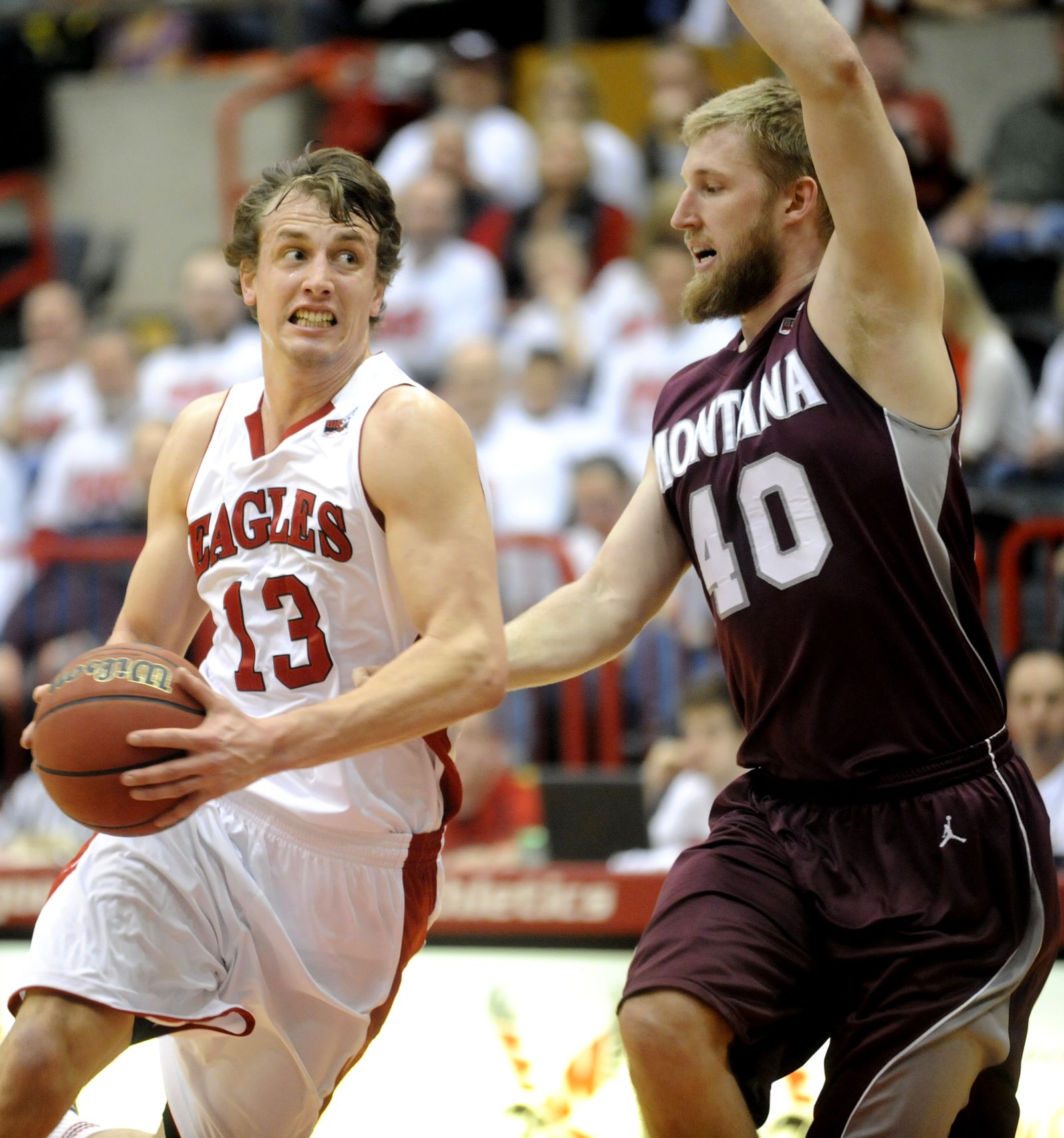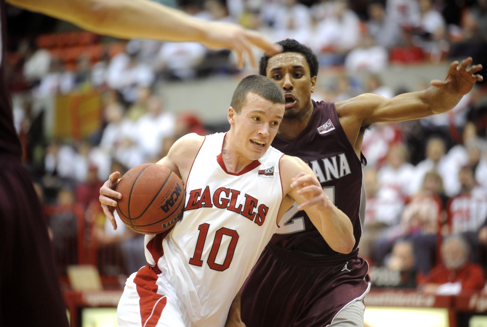 Eastern guard Parker Kelly (10) battles Montana forward Eric Hutchinson (45) for a rebound during the first half.