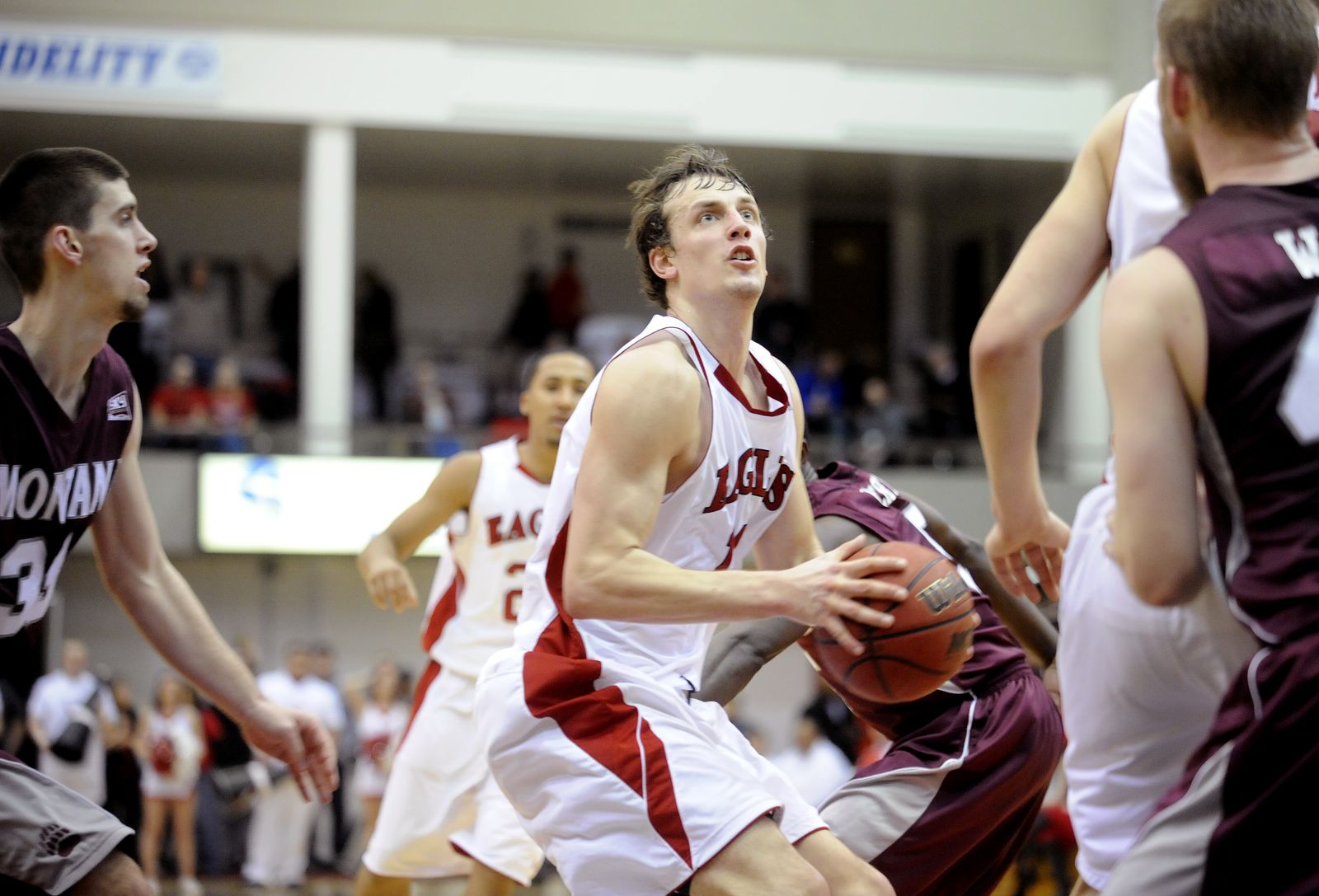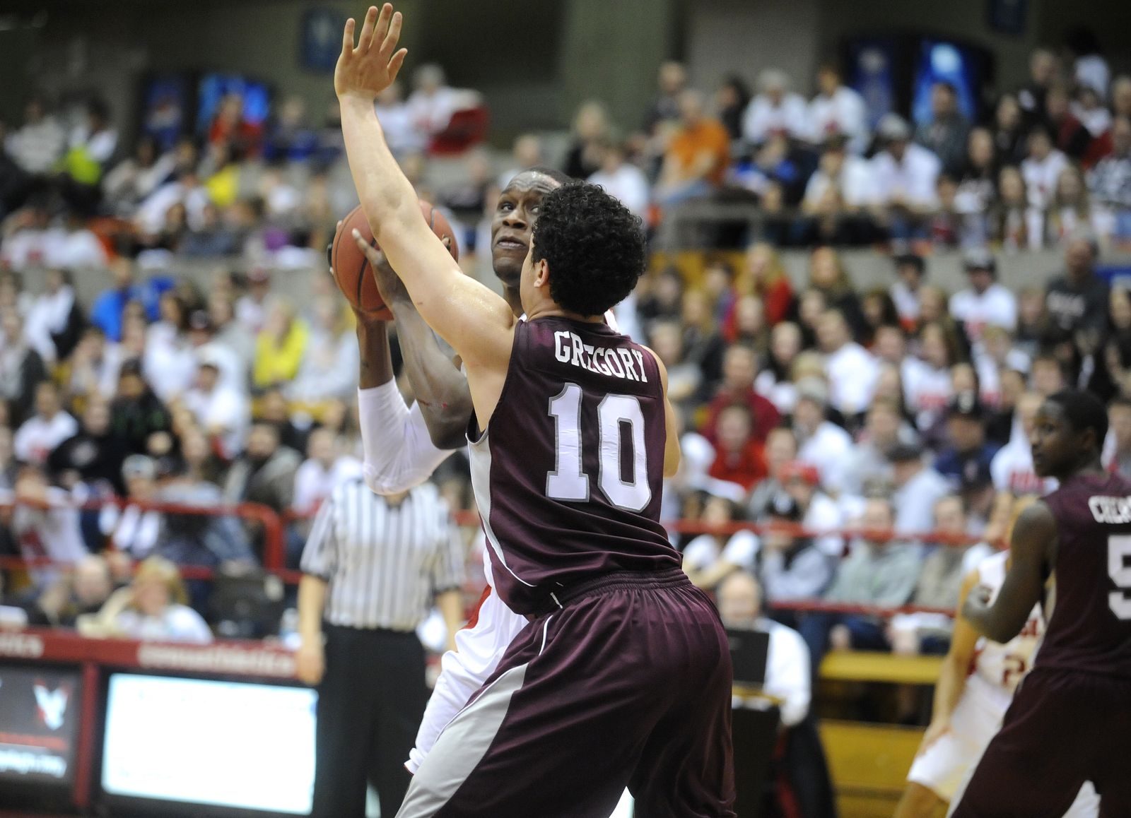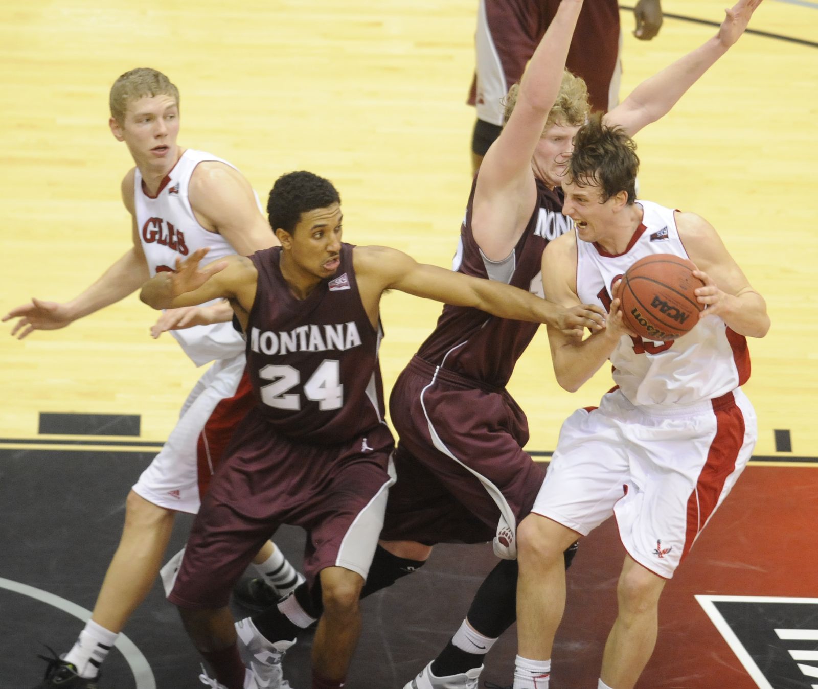 Eastern guard Parker Kelly (10) battles Montana forward Eric Hutchinson (45) for a rebound during the first half.