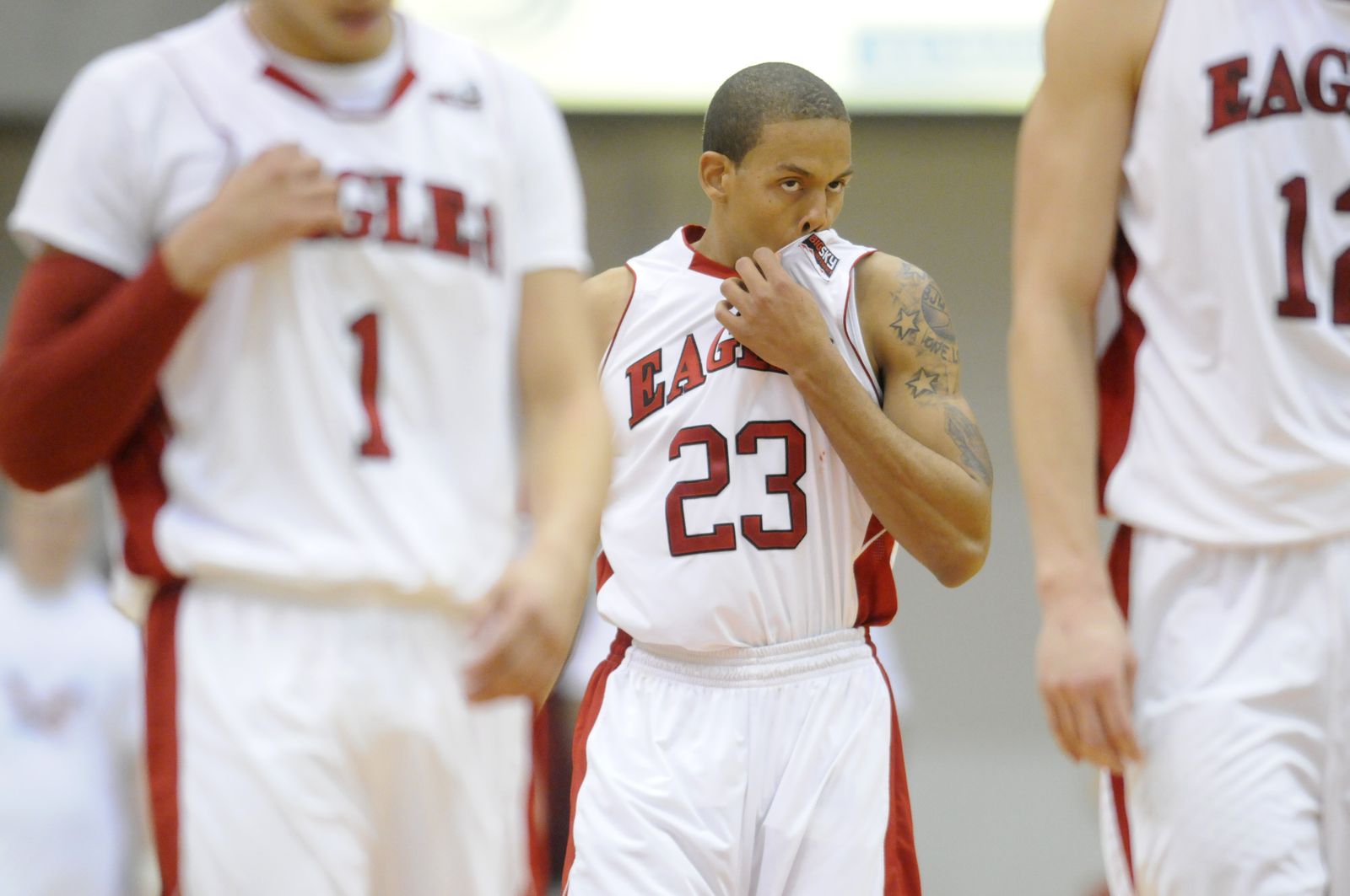 Eastern guard Kevin Winford (23) reacts as he heads to a timeout with teammates against Montana during the second half.