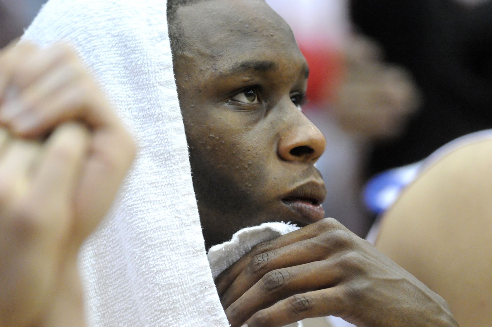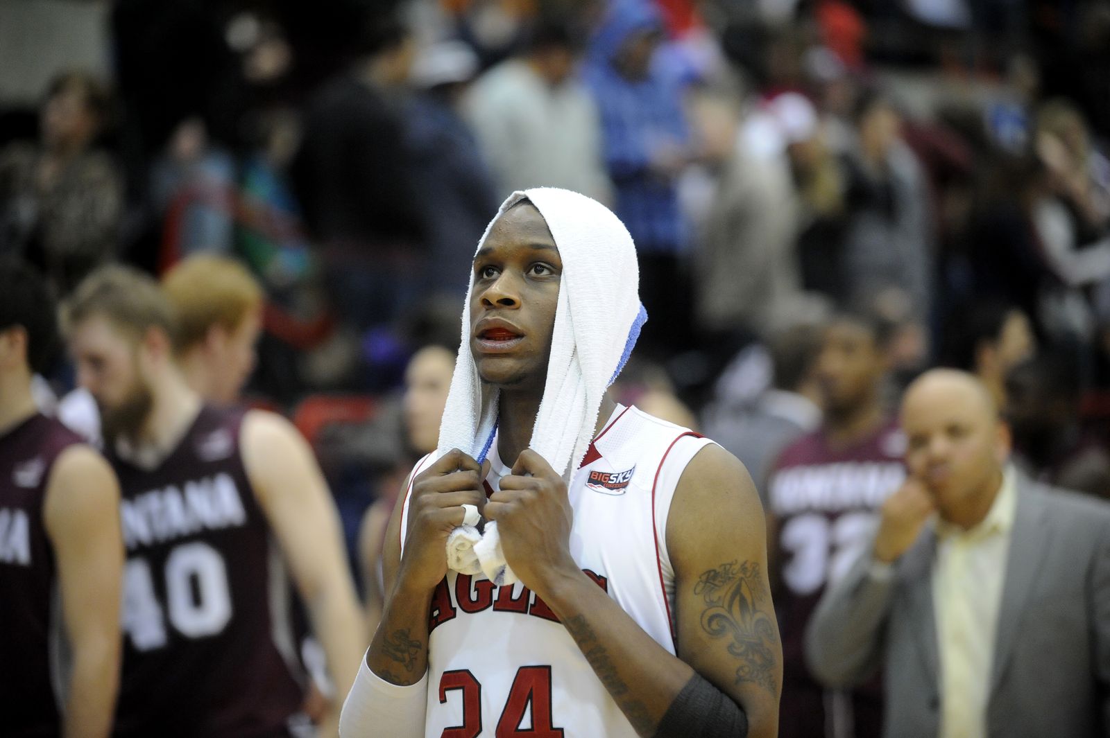 Eastern forward Collin Chiverton (24) stares at the scoreboard while walking to the locker rooms after falling to Montana during the second half.