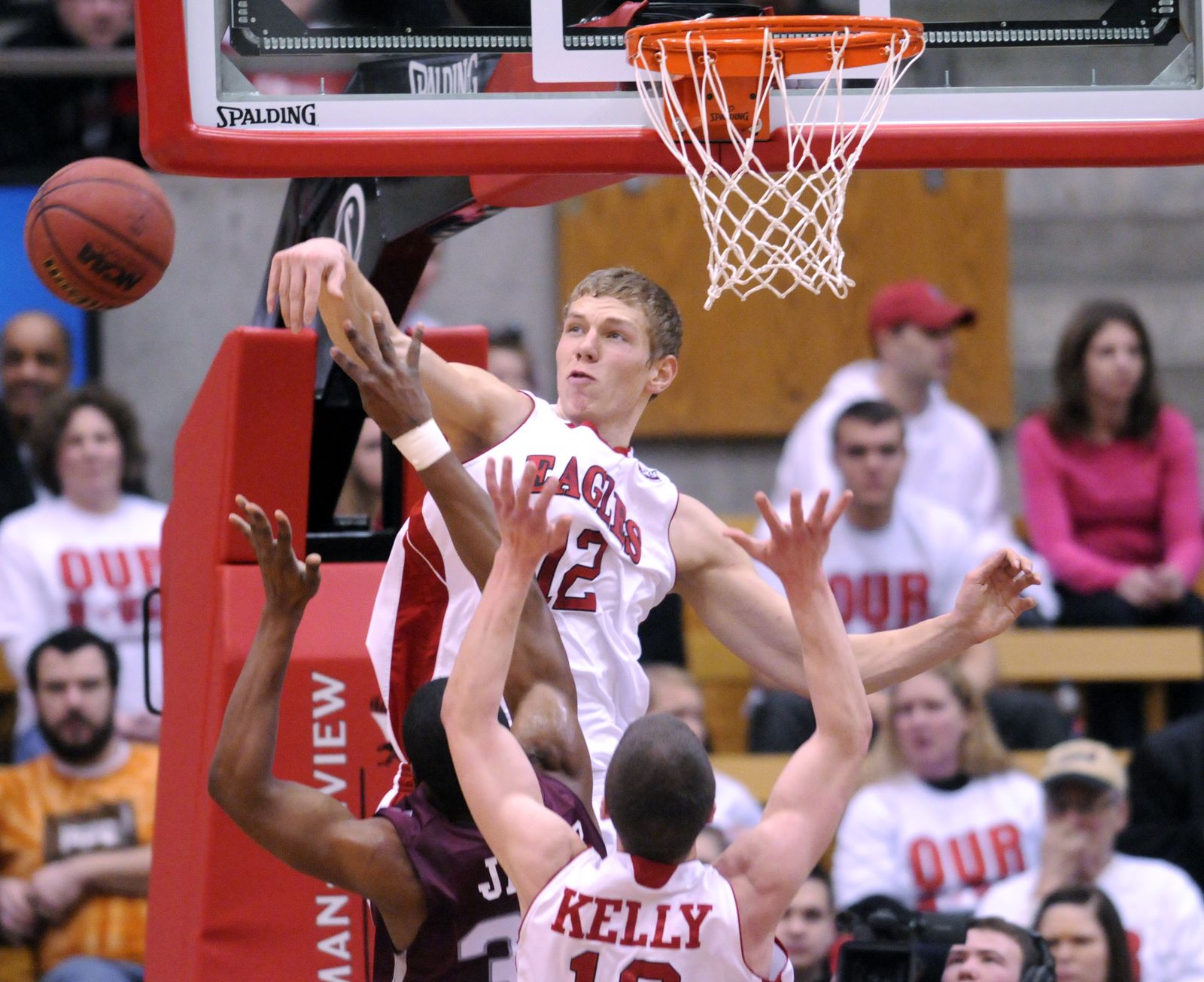 Eastern forward Martin Seiferth (12) blocks Montana guard Kareem Jamar’s (32) shot during the first half.
