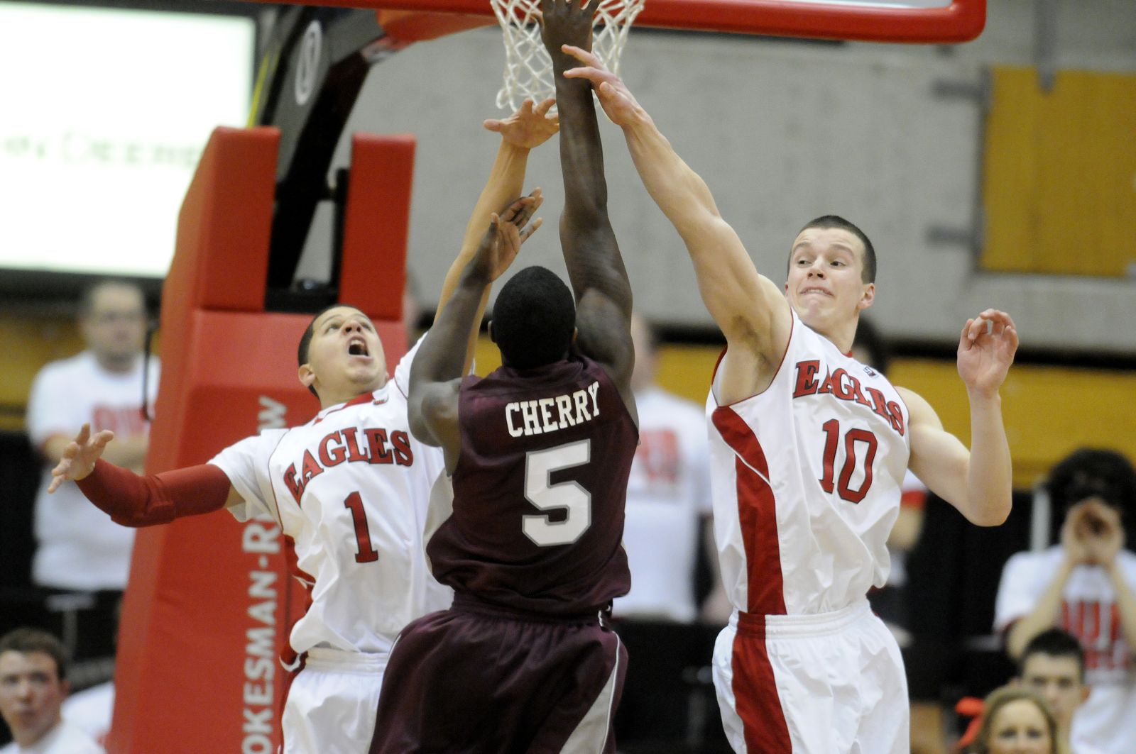 Eastern guards Tyler Harvey (1) and Parker Kelly (10) try to stop Montana guard Will Cherry (5) as the clock runs down in the second half.