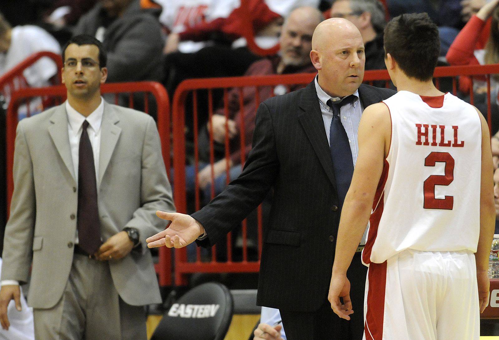 Eastern head coach Jim Hayford speaks with guard Daniel Hill (2) after pulling him off the floor against Montana during the first half.