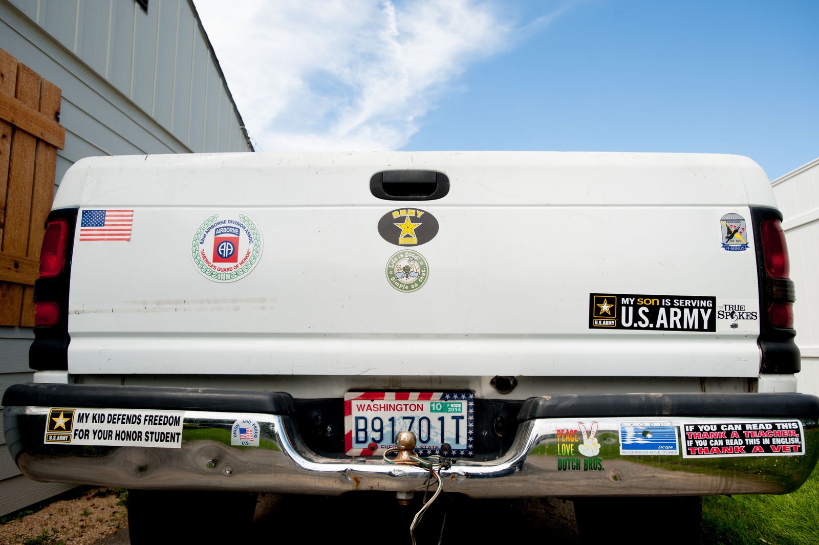 The tailgate of Bill Weed’s pickup is seen decorated in in stickers commending his father Jerry, and his son Tyler’s service in the Army; as seen on Friday, July 4, 2014, in Spokane, Wash.
