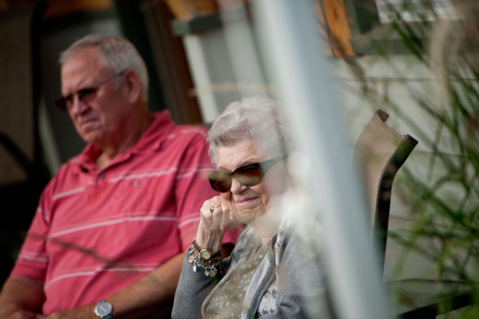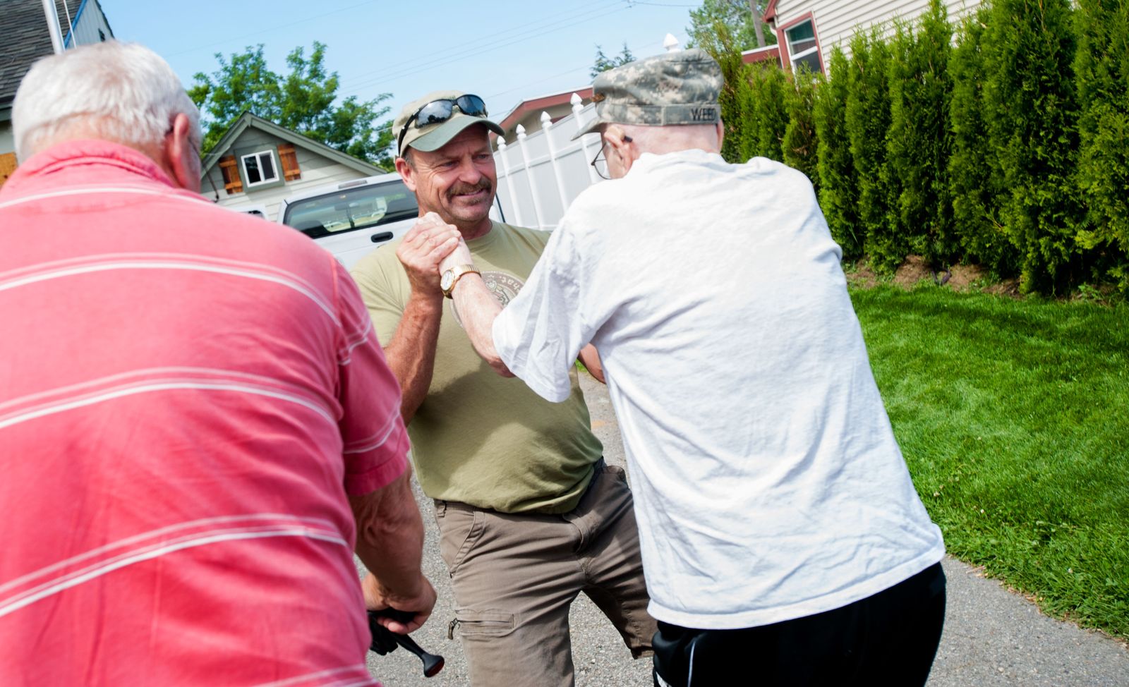 95-year-old Jerry Weed is helped up by his son Bill, on Friday, July 4, 2014, in Spokane, Wash.