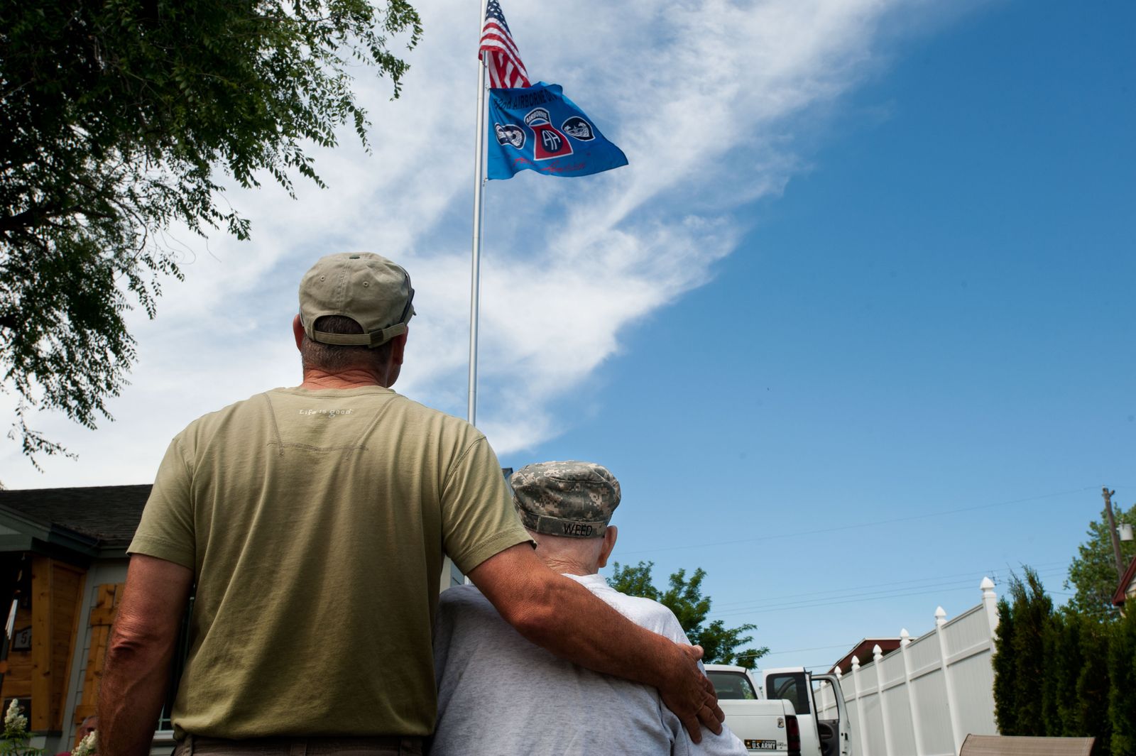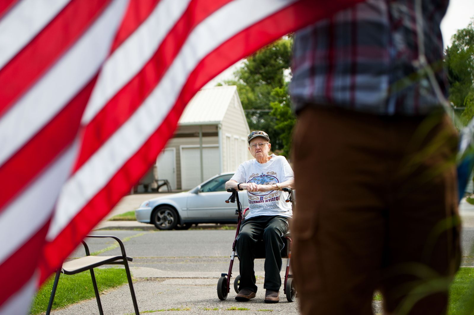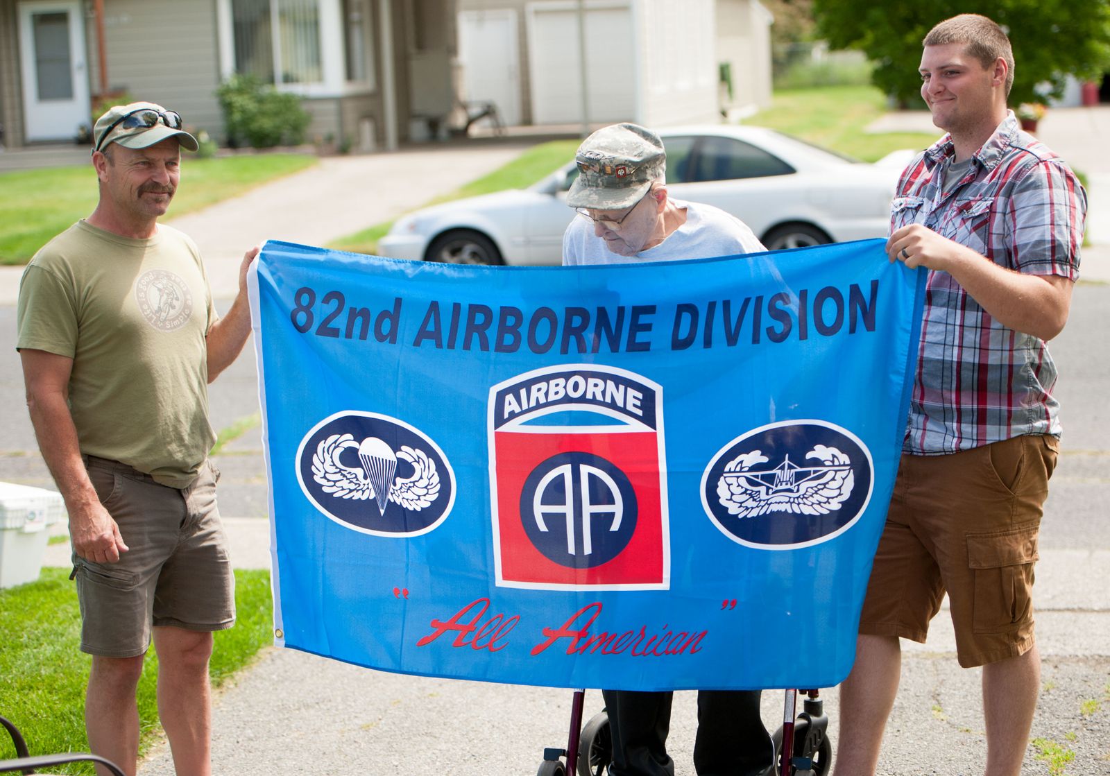 95-year-old Jerry Weed, watches as his son Bill and grandson Tyler erect American and 82nd Airborne flags in his honor on Friday, July 4, 2014, in Spokane, Wash. The Sr. Weed served with the 82nd Airborne in World War II and jumped with them in the D-Day invasion of Normandy, France. Jerry’s grandson Tyler currently serves in the U.S. Army Reserve.