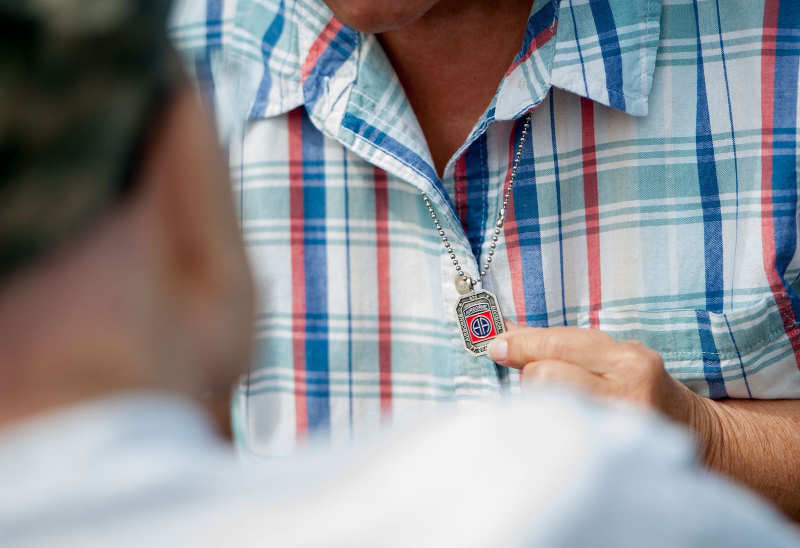 Jerry Weed’s daughter Patti Rees proudly shows him the 82nd Airborne pendent she wore in his honor on Friday, July 4, 2014, in Spokane, Wash.