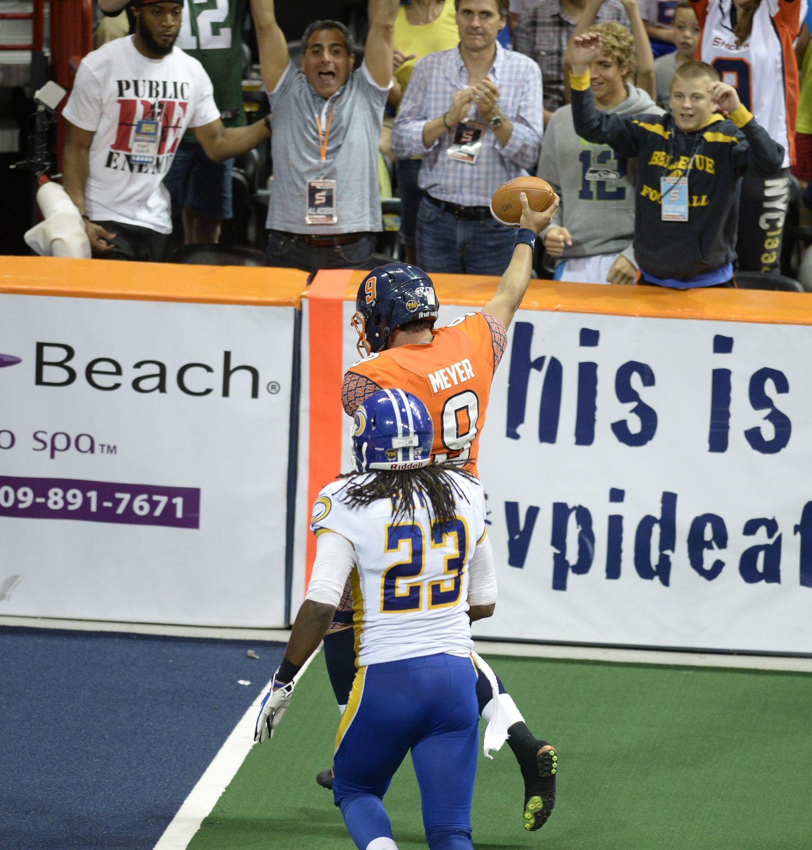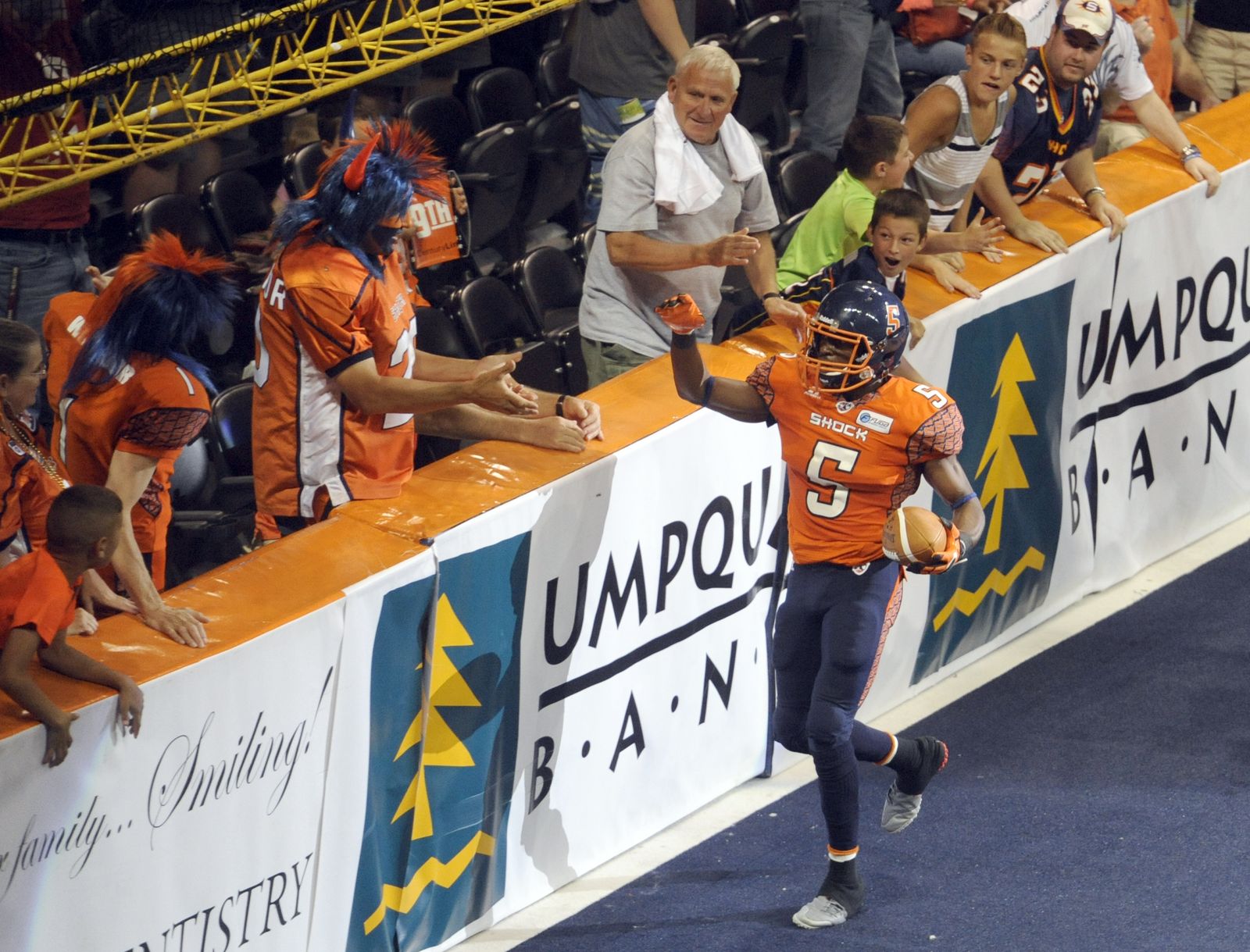 Terrance Sanders of the Spokane Shock runs over celebrate with fans in the endzone after he intercepted a Tampa Bay pass and ran it in for a touchdown Monday, July 21, 2014 at the Spokane Arena. The Shock beat the Tampa Bay Thunder 55-52.