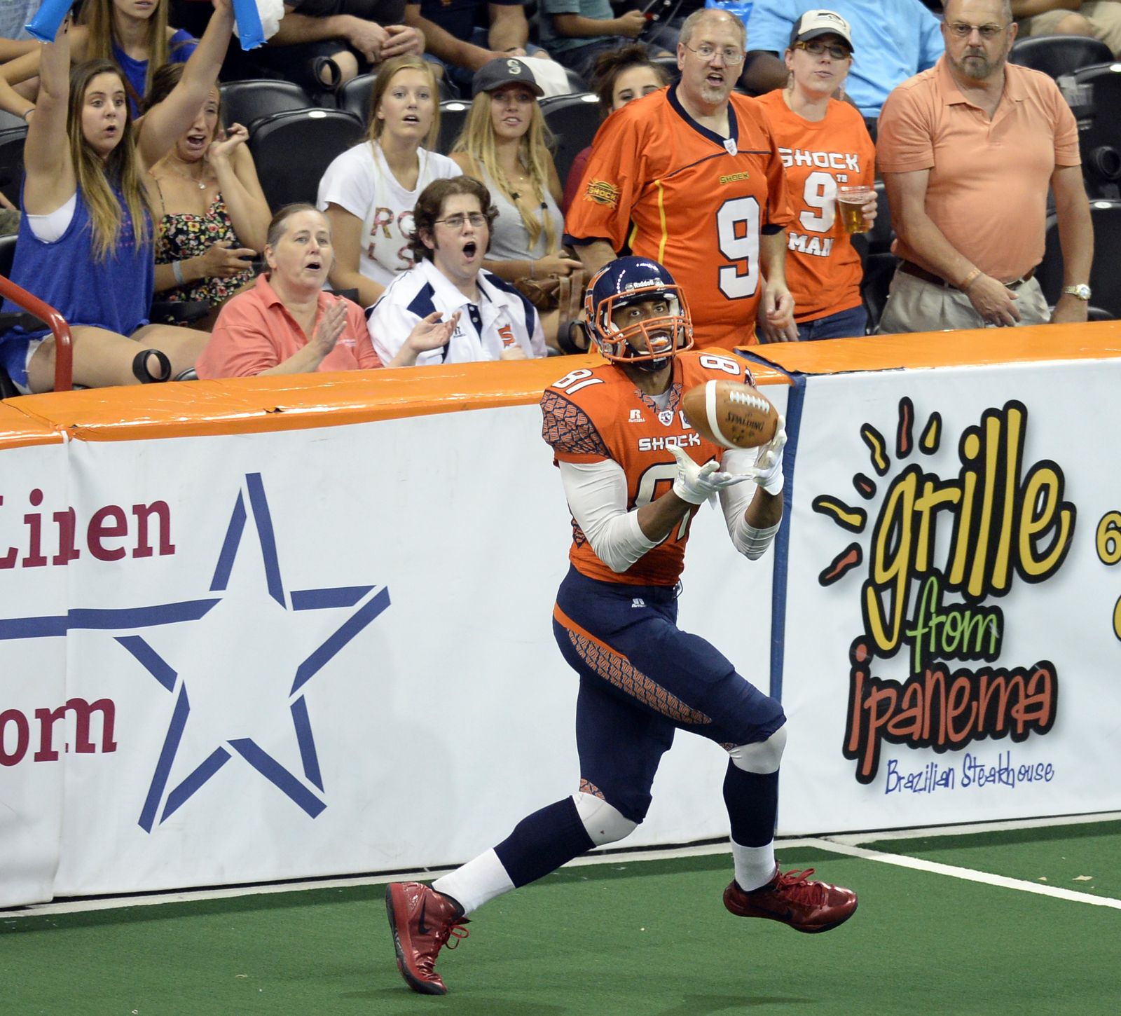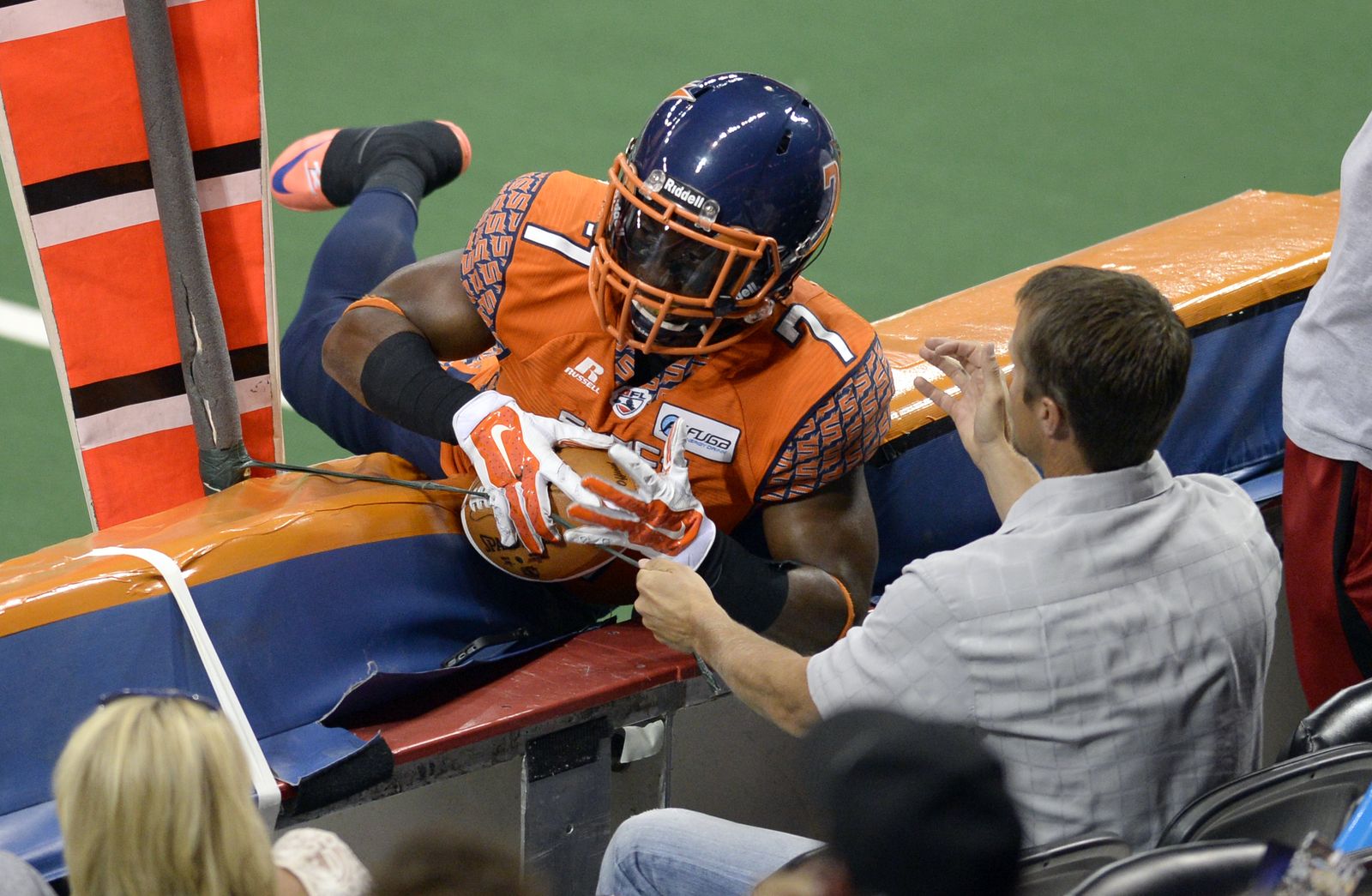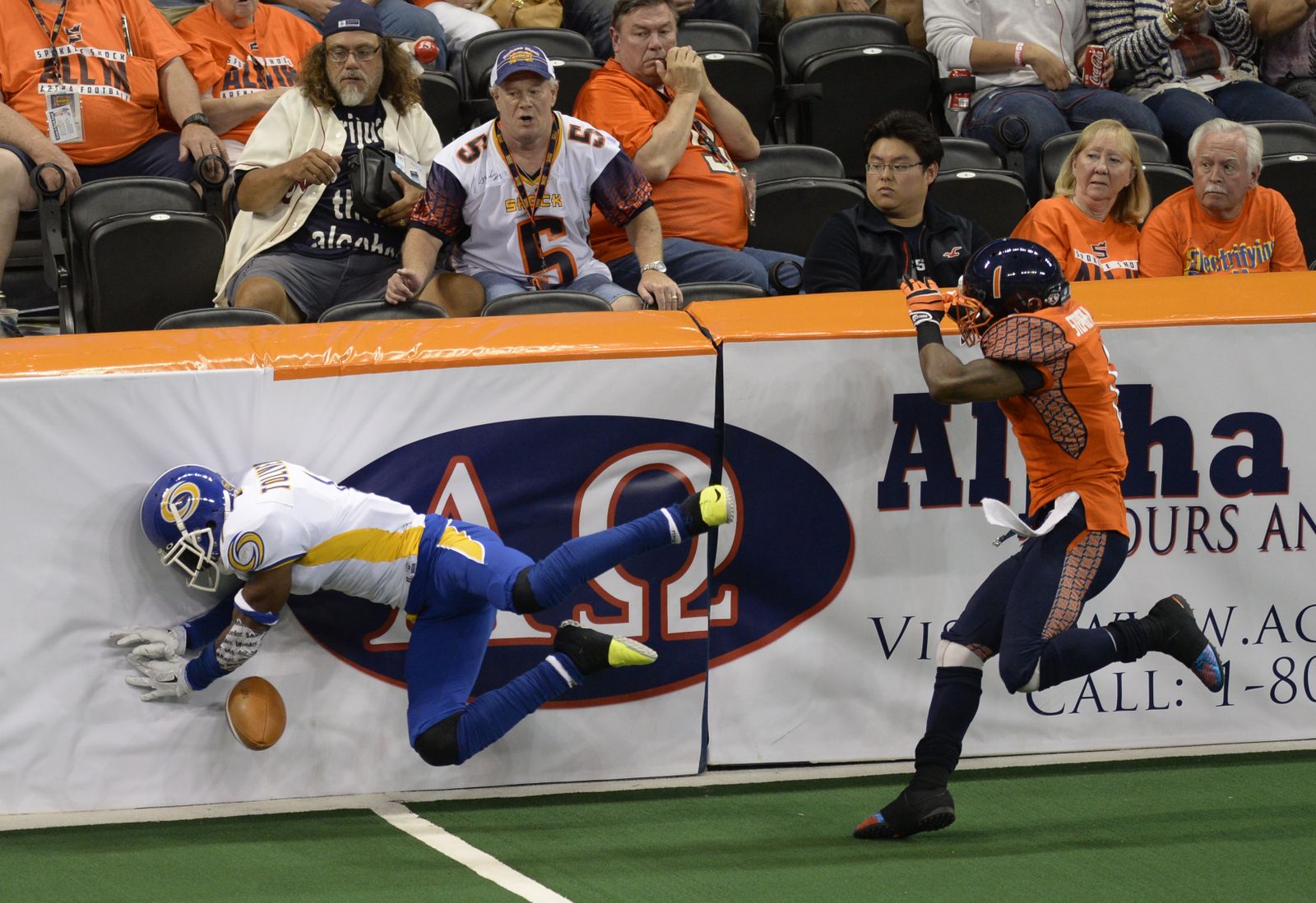 Mike Washington of the Spokane Shock makes a diving reception on top of the wall against Tampa Bay Monday, July 21, 2014 at the Spokane Arena. The call was challenged on the believe that a fan touched the ball, but it was confirmed. The Shock beat the Tampa Bay Thunder 55-52.